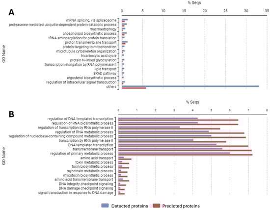 Overrepresented categories in the detected proteome (Figure 2A) include RNA splicing, macroautophagy, phospholipid biosynthesis, and proton transmembrane transport, with a notable proportion classified as “other.” In contrast, 18 biological process categories are underrepresented (Figure 2B), including key functions such as transcription, transmembrane transport, primary metabolism, amino acid biosynthesis, DNA damage response, and mycotoxin production.