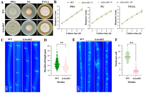 The activated WT and ΔAochk1 strains were cultured on PDA, TG, and TYGA media at 28 °C for 5 days. Colony diameter was measured daily to assess growth rate. The result revealed that Aochk1 deletion did not alter mycelial growth rate (Figure 1A,B). Concurrently, CFW staining revealed a significant reduction in mean hyphal compartment length concomitant with increased septation frequency in the mutant strain relative to WT (Figure 1C,D). Furthermore, DAPI staining revealed a statistically significant reduction in mean nuclear count per mycelial cell in the mutant strain relative to WT, with WT exhibiting an approximately six-fold higher nuclear density (Figure 1E,F).