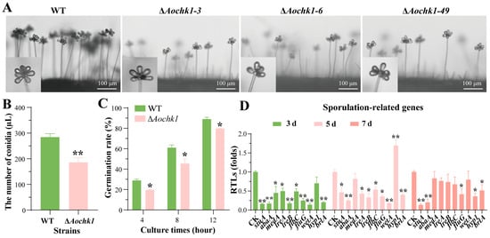 3.3. Deletion of Aochk1 Impairs Sporulation and Germination Rate