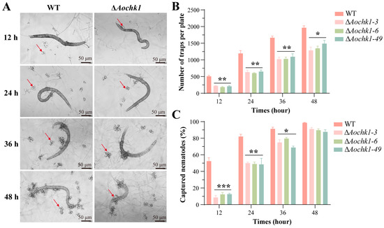Trap morphogenesis is a critical step for the nematode predation and lifestyle transition of A. oligospora. To further investigate the role of Aochk1 in trap formation and pathogenicity, the trap formation was observed and quantified after the WT and ΔAochk1 mutant strains were induced in C. elegans. The results showed that the mutant strain exhibited a significant reduction in trap production and nematode predation efficiency compared to the WT (Figure 3A). Traps were formed in both WT and mutant strains at 12 h after induction, but the number of traps in the mutant strain was 50% lower than in the WT strain. This corresponded with markedly divergent nematocidal capacity; WT achieved 50% mortality versus 10% for the mutant. Although trap morphology showed no significant differences thereafter, the mutant consistently demonstrated fewer traps and substantially attenuated virulence at 24, 36, and 48 h post-induction (Figure 3B,C).