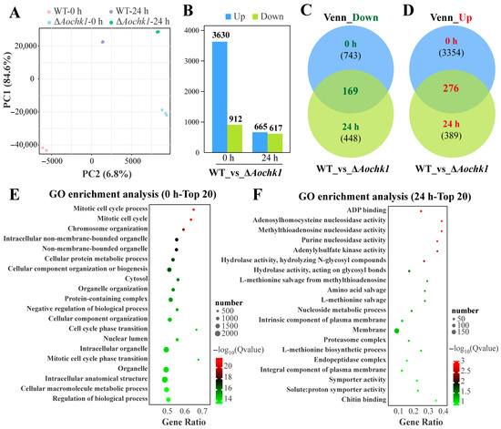 Transcriptomic profiling of the ΔAochk1 mutant strain. (A) Principal component analysis of transcriptomes from WT and ΔAochk1 mutant strains. (B) Bar plot showing the number of differentially expressed genes (DEGs). (C) Venn diagram of consistently downregulated DEGs shared at both 0 h and 24 h post-induction. (D) Venn diagram of consistently upregulated DEGs shared at both 0 h and 24 h post-induction. (E,F) Top 20 significantly enriched GO terms for DEGs identified at 0 h (E) and 24 h (F) (ΔAochk1 vs. WT).