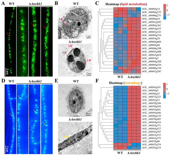Comparison of lipid droplets (LDs) and autophagy between WT and ΔAochk1 mutant strains. (A) Staining of LDs in hyphae of WT and ΔAochk1 strains. Red arrows: lipid droplets. Bar = 3 µm. (B) Transmission electron microscopy (TEM) of intracellular LDs in WT and ΔAochk1 strains, Bar = 2 μm. (C) Cluster analysis of the expression levels of lipid metabolism-related genes in WT and ΔAochk1 mutant strains. (D) Autophagosomes in hyphae of WT and ΔAochk1 strains. Yellow arrows: autophagosomes. Bar = 3 µm. (E) Observation of autophagosomes by TEM, Bar = 2 μm. (F) Cluster analysis of the expression levels of autophagy-related genes in WT and ΔAochk1 mutant strains.