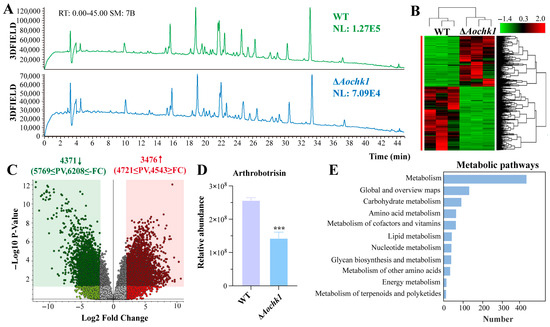 Comparative secondary metabolomic profiling of WT and ΔAochk1 mutant strains. (A) HPLC chromatograms of secondary metabolites extracted from WT and ΔAochk1 strains. (B) Clustering analysis of differential metabolites between strains. (C) Volcano plot of upregulated and downregulated metabolites. (D) Comparison of arthrobotrisin relative abundance between WT and mutant strain. (E) KEGG enrichment analysis of differential metabolites. (Tukey’s HSD test: *** p < 0.001).