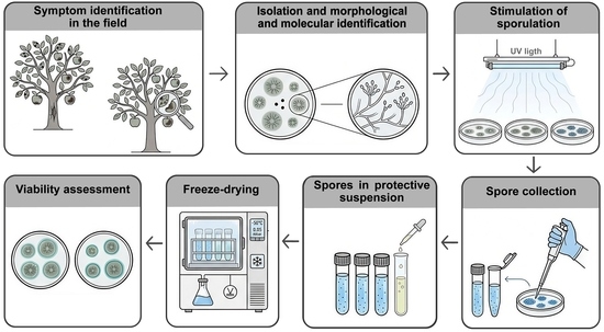 Valdez-Tenezaca, A.; Gutiérrez, M.E.; Guerra, M.; Castro, J.F.; Covarrubias, S.A.; Díaz, G.A. Methods to Stimulate Sporulation and Freeze-Drying Strategies for the Conservation of Diplodia mutila, Diplodia seriata, Lasiodiplodia theobromae, and Neofusicoccum arbuti Isolated from Apple Trees with Canker and Dieback Symptoms. J. Fungi 2025, 11, 640. https://doi.org/10.3390/jof11090640
