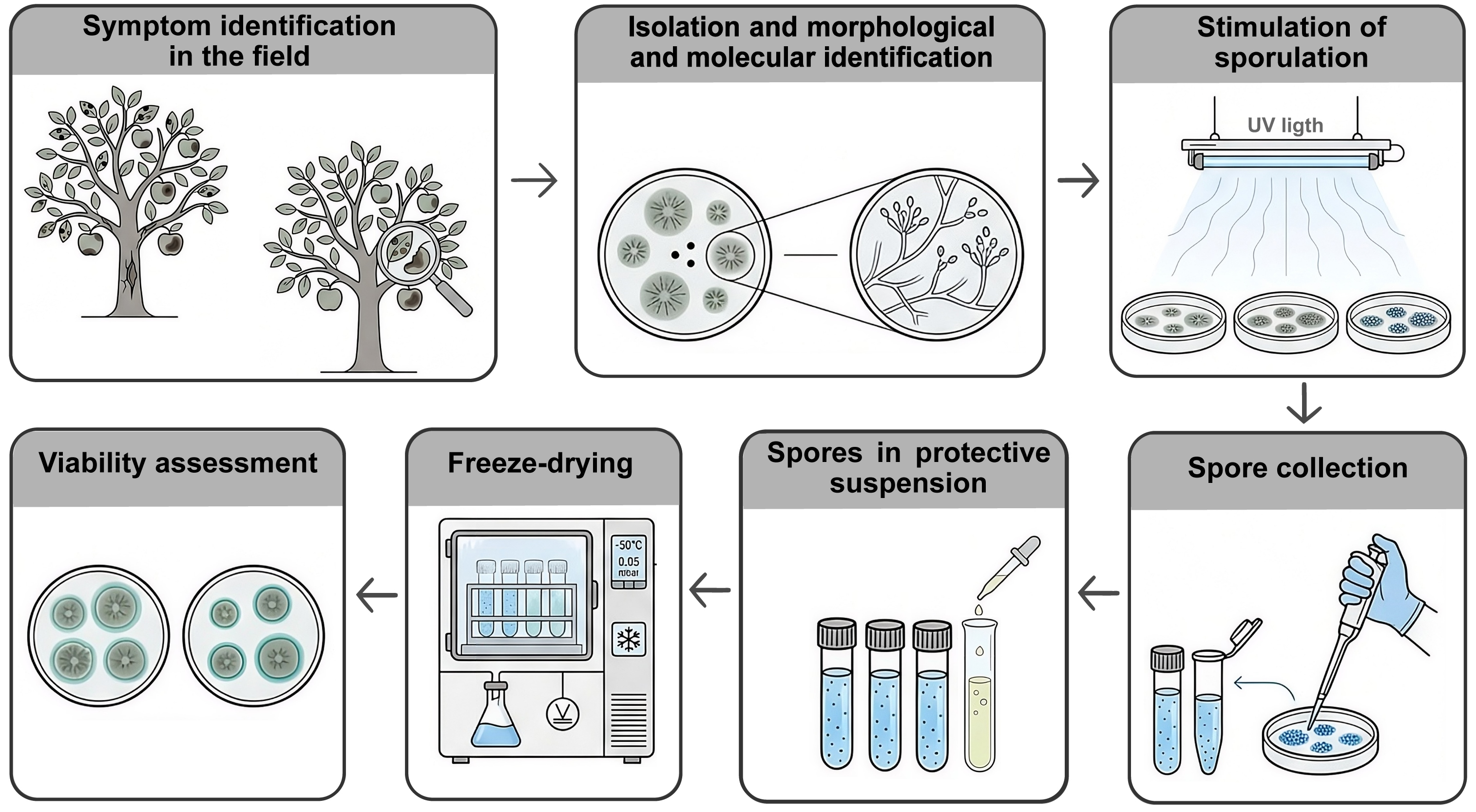 Valdez-Tenezaca A, Gutiérrez ME, Guerra M, Castro JF, Covarrubias SA, Díaz GA. Methods to Stimulate Sporulation and Freeze-Drying Strategies for the Conservation of Diplodia mutila, Diplodia seriata, Lasiodiplodia theobromae, and Neofusicoccum arbuti Isolated from Apple Trees with Canker and Dieback Symptoms. Journal of Fungi. 2025; 11(9):640. https://doi.org/10.3390/jof11090640