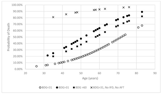 Multivariable logistic regression analysis confirmed that age and a combined variable where BDG was >31 pg/mL, but there was no IFD or AFT, were significantly associated with mortality (p < 0.0001). While the association with age generated a significant, yet minimal odds ratio (1.0472, 95% CI: 1.0111–1.0846, p: 0.01), the combined variable generated a significant and substantial odds ratio (25.7889, 95% CI: 3.0357–219.0793, p: 0.0029) that equated to, on average, a substantial 3.38-fold increase in the probability of death across all ages (Figure 1).