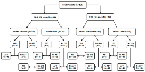 Thirty-four percent (42/125) of patients received AFT deemed appropriate for the management of their IFD. When not considering BDG concentration, the mortality rate when AFT was administered was comparable to that in the absence of AFT (16/42: 38.1% vs. 31/83: 37.4%, p: 1.0000). Mortality remained similar for patients receiving AFT, regardless of the calculated BDG concentration (Table 2). However, in patients not receiving AFT, the presence of a BDG concentration > 31 pg/mL was associated with a significant increase in mortality (92%) compared to those with BDG ≤ 31 pg/mL (27%). Using a higher BDG threshold of ≥60 pg/mL was associated with a 100% mortality rate in patients not receiving AFT, significantly greater than in patients not receiving AFT but with a BDG concentration < 60 pg/mL (33%, p: 0.0008).