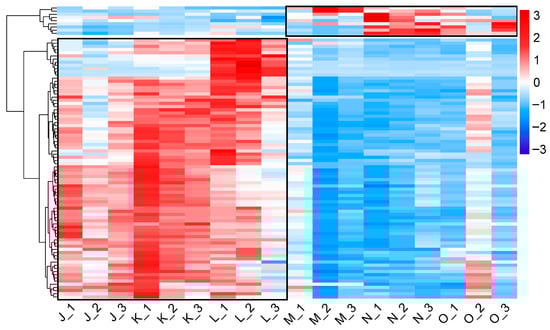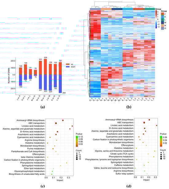 The differentially accumulated metabolites (DAMs) were screened based on VIP ≥ 1 and p < 0.05. This analysis yielded 625 DAMs at three developmental stages of both control and CO2-enriched treatment groups (nine pairwise comparison sets: J vs. K; K vs. L; J vs. L; M vs. N; N vs. O; M vs. O; J vs. M; K vs. N; L vs. O) (Supplementary Table S2, Figure S1). Specifically, intra-group temporal comparisons within the control group (J vs. K; K vs. L; J vs. L) identified 263, 223, and 142 DAMs, respectively (Figure 2a). Conversely, the CO2-treated group exhibited distinct dynamics, with M vs. N, N vs. O, and M vs. O comparisons yielding 86, 408, and 451 DAMs correspondingly. Meanwhile, cross-group analysis at equivalent developmental phases demonstrated CO2-induced metabolic perturbations: 387, 337 and 445 DAMs were identified in J vs. M, K vs. N, and L vs. O, respectively. These findings were further confirmed by Venn diagrams and the heatmap of hierarchical clustering of DAMs (Figure 2b).