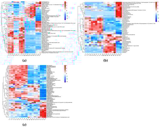 Differential landscape of bioactive compounds in G. lucidum cultivated under both normal and high CO2 concentrations; (a) Heatmap of 56 differentially accumulated triterpenoids; (b) Heatmap of 46 differentially accumulated steroids and steroid derivatives; (c) Heatmap of 64 differentially accumulated amino acids, peptides, and analogs.