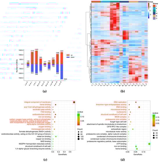 Differentially expressed genes (DEGs) were identified from the nine comparative groups based on the criteria of a |Fold Change| ≥ 2 and an FDR < 0.01. Using FPKM data, a total of 5913 DEGs were identified among fruiting body samples (Figure 5a and Supplementary Table S4). Specifically, L vs. O contained the largest number of the DEGs (1291 up-regulated and 1642 down-regulated) and the DEGs in the J vs. M, K vs. N, and L vs. O groups increased sequentially, indicating that the number of DEGs between the control group and the high-CO2 cultivation group gradually increased as the fruiting bodies matured. The clustering heat map of DEGs further illustrated distinct gene expression patterns across the different groups in this experiment (Figure 5b).