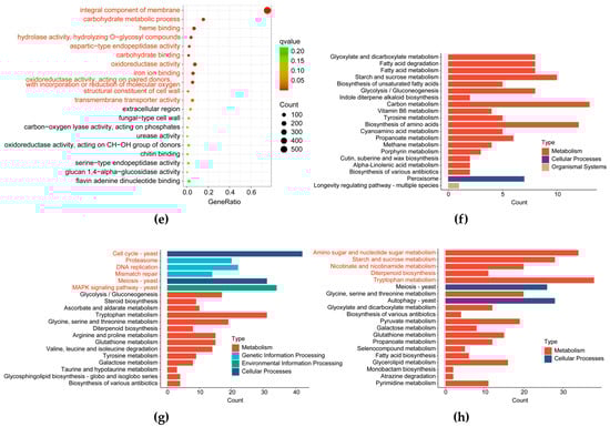 Transcriptomic characteristics of G. lucidum cultivated under different CO2 conditions. (a) Statistical analysis of DEGs.; (b) The heatmap of transcriptomic data. The rows represent individual DEGs and the columns represent the sample groups. The color gradient indicates the relative expression level, with red signifying high expression and blue signifying low expression; (c–e) GO enrichment bubble plot for DEGs in J vs. M (c), K vs. N (d), and L vs. O (e). The x-axis shows the ratio of the number of DEGs to the total number of genes annotated within a specific GO term (representing enrichment level) and the y-axis represents the GO term, respectively. The size of the bubble represents the number of DEGs in the term, and the color corresponds to the q-value (redder colors indicate higher significance). Terms highlighted in red text are significantly enriched (q < 0.05); (f–h) KEGG enrichment bar plot for the DEGs in J vs. M (f), K vs. N (g), and L vs. O (h). The y-axis lists the KEGG pathways and the number at the end of each bar represents the count of DEGs enriched in that pathway. Terms highlighted in red text are significantly enriched (q < 0.05).