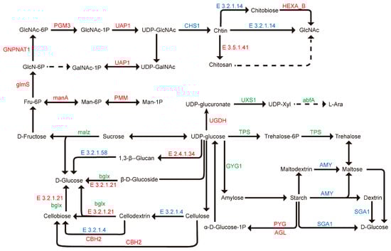 Expression of DEGs enriched in the amino sugar and nucleotide sugar metabolism and starch and sucrose metabolism pathways in the comparison group L vs. O. Genes in red or blue refer to up- or down-regulation responding to CO2, respectively. Genes in green refer to both up- and down-regulation in response to CO2.