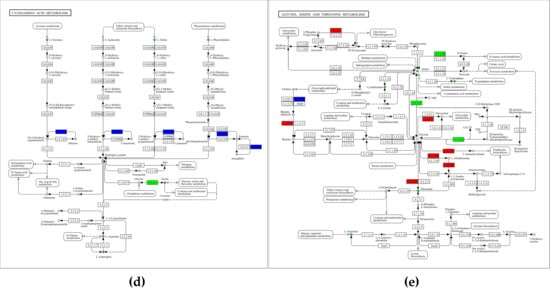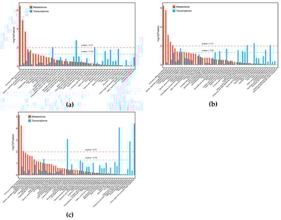 An integrated transcriptomic and metabolomic approach was used to further investigate the response of G. lucidum to high CO2 concentrations. In the J vs. M, K vs. N, and L vs. O comparisons, KEGG co-enrichment analysis was conducted based on DEGs and DAMs. Specifically, in the J vs. M comparison, both DAMs and DEGs were significantly enriched in cyanoamino acid metabolism (Figure 9a,d). In the K vs. N comparison, both DAMs and DEGs were significantly enriched in glycine, serine and threonine metabolism (Figure 9b,e). However, in the L vs. O comparison, DAMs and DEGs shared no commonly enriched pathways (Figure 9c). Amino acids are essential for fruiting bodies’ growth and development. Beyond their involvement in energy metabolism, they act as osmolytes that alter cellular osmotic pressure. These results indicate that amino acid metabolic pathways in G. lucidum are severely affected under high CO2 concentrations.