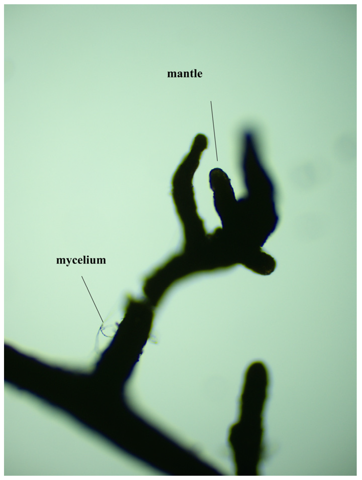 - Tateishi, T.; Yokoyama, K.; Kohno, N.; Okabe, H.; Marumoto, T. Estimation of mycorrhizal colonization of the roots of oak seedlings inoculated with an ectomycorrhizal fungus, Laccaria amethystea. Soil Sci. Plant Nutr. 2003, 49, 641–645. [Google Scholar] [CrossRef]
