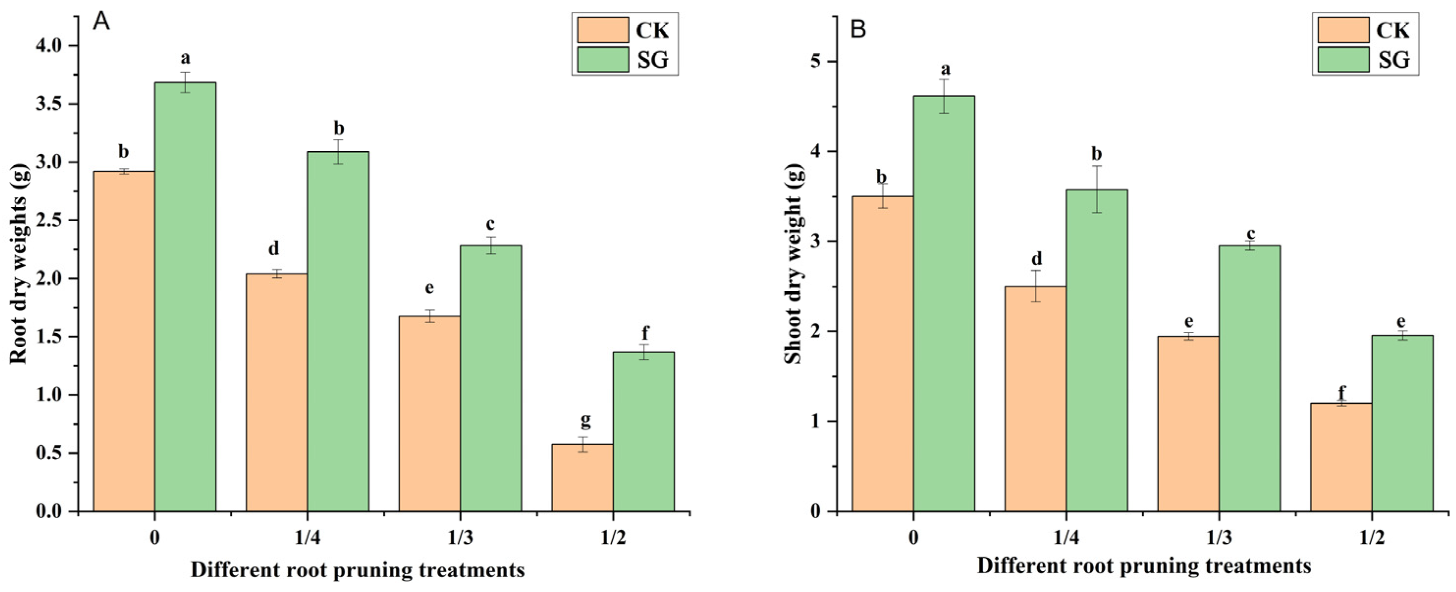 | SG | 1/4 | 342.06 ± 15.81 b | 60.97 ± 3.47 b | 277.69 ± 7.95 b | 2.29 ± 0.35 ab | 66.58 ± 8.08 b | 6.23 ± 0.53 b | 1684.33 ± 107.91 b |