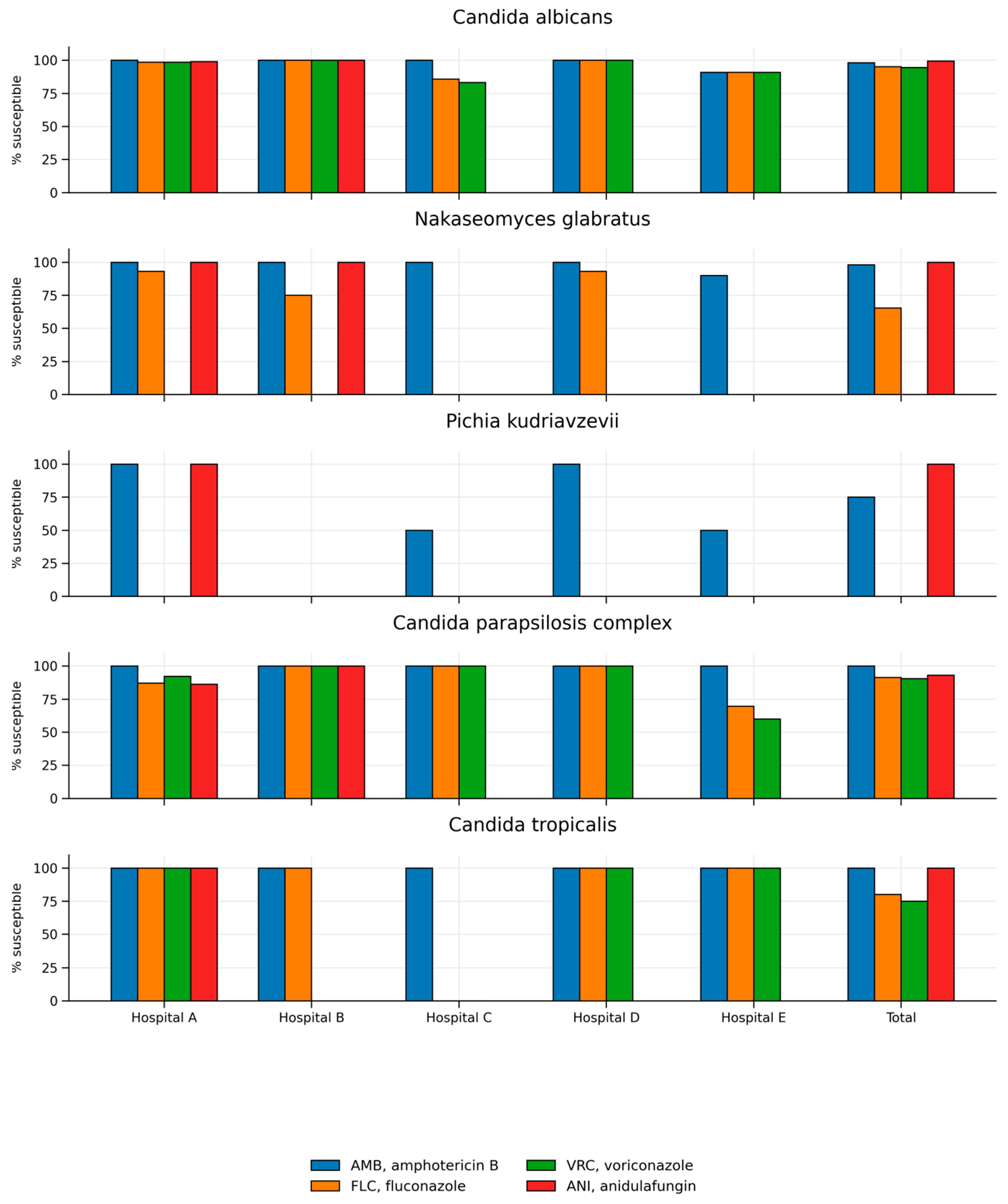 | Candida Species | Hospital A | Hospital B | Hospital C * | Hospital D | Hospital E | Total |