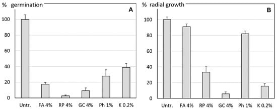 In vitro experiments on (A) the mean germination of Phytophthora infestans (Pi) sporangia and (B) the radial mycelium growth of Pi. Effect of 4% suspensions of the botanicals Frangula alnus (FA), Rheum palmatum (RP) and Galla chinensis (GC), of a 1% suspension of Phosfik® (Ph) and of 0.2% Kocide DF (K). Untr. = Untreated control with water. Error bars indicate the standard errors of the means of three experimental runs with four replicates for each treatment.