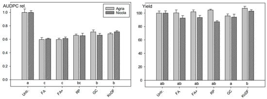 Field experiment in 2010 at Tänikon with the two potato varieties Agria and Nicola: Effect of suspensions of botanical powders of Frangula alnus (FA & FA+), Rheum palmatum (RP) and Galla chinensis (GC), as well as the copper fungicide Kocide DF (KoDF) on foliar blight (relative AUDPC) and the potato tuber yield (%). Treatments are described in Table 2. Untr. = Untreated control. Bars: Mean values of the varieties and standard errors of the means. AUDPC rel.: Area under the disease progress curve relative to the untreated control. Treatments labelled with the same letter are statistically not different (Tukey test p < 0.05).