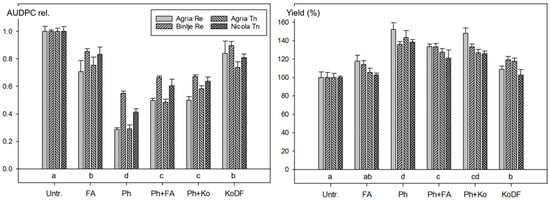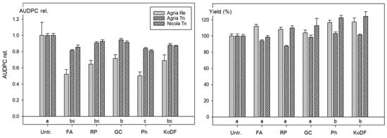 The impact of the different weather conditions at the two experimental sites is reflected by the AUDPC data. At Reckenholz, the best performing treatments reduced the AUDPC of Agria by about 50%, whereas in Tänikon, the reduction for Agria and Nicola was below 20% (Figure 3). The effect on the AUDPC was significant (p < 0.05) for all treatments. The treatments with Ph, FA and RP performed as well as those with the copper fungicide (Figure 3 and Table S3). The impact of the treatments on the AUDPCs was similar for both varieties and both locations, however, this was not the case for the yield (Figure 3). The coefficient of correlation for the AUDPC and the yield data was r = 0.85 for the treatment averages of Agria at Reckenholz and r = 0.63 for those of Nicola in Tänikon, but only r = 0.04 for Agria in Tänikon. For data pooled over both locations, significantly (p < 0.05) higher yields resulted with KoDF (14%) and Ph (14%) compared with the untreated control (Figure 3 and Table S3).