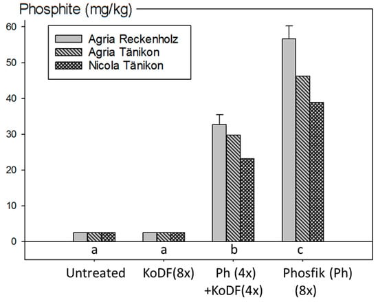 Treatments with two, four or eight applications of Phosfik® were followed by eight, four or two applications with Kocide Opti™ (Ko; more recent formulation of copper hydroxide) were conducted, and only small, non-significant (p > 0.05), differences in AUDPC and yield effects were observed (Table S5). As in 2012, the content of PO33− in the tuber samples of the three treatments with Ph showed a clear correlation with the applied amount of the product. The application of four or eight times 1.5 L/ha Ph resulted in residues of 12.3 and 22.8 mg/kg PO33−, respectively. The residues for the treatment with two Ph applications were below the limit of detection (LOD) of 5 mg/kg (Figure 6).