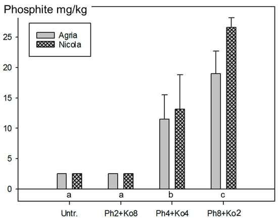 Residues of phosphite (PO33−) in potato tubers from the field experiments in 2013 with two (Ph2 + Ko8), four (Ph4 + Ko4) and eight (Ph8 + Ko2) applications of 1.5 L/ha Phosfik® (Ph) on the potato foliage and the untreated control (Untr.). Treatments are described in Table S5. Bars represent the mean values from samples of Agria and Nicola at Reckenholz and Tänikon (two samples per treatment) and standard errors of the means. The samples consisted of a mixture of tubers from the four replicates. Since samples from the untreated control (Untr.) and the treatment with two Ph applications (Ph2 + Ko8) were below the limit of detection (LOD = 5 mg/kg), half of the LOD was plotted. Treatments labelled with the same letter are statistically not different (Tukey test p < 0.05).