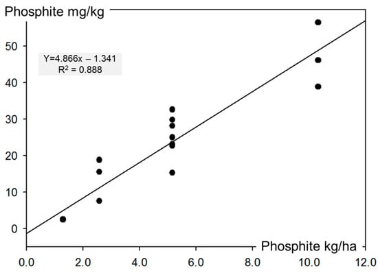 Correlation between the total amount of phosphite (PO33−) applied with Phosfik® (x-axis) and the measured phosphite residues in potato tubers (y-axis) from the field experiments in 2012 (n = 6) and 2013 (n = 12). Four samples with 1.29, seven with 5.16, four with 2.58 and three with 10.32 kg PO33−/ha, respectively.