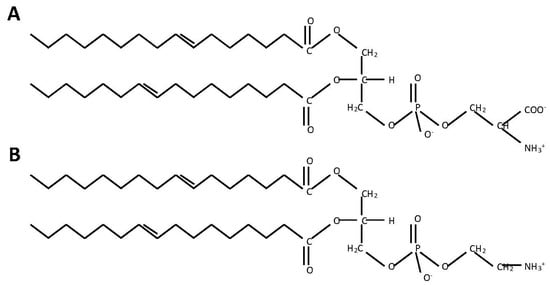 The structure of (A) phosphatidylserine and (B) phosphatidylethanolamine.