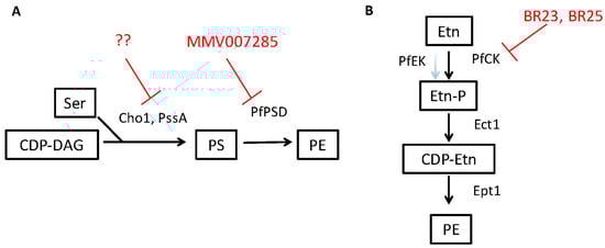 Potential targets and inhibitors for phosphatidylserine and phosphatidylethanolamine synthesis. (A) Potential inhibition points for the de novo pathway. The phosphatidylserine (PS) synthase from fungi (Cho1) and some bacteria (PssA) that convert cytidine diphosphate diacylglycerol (CDP-DAG) and serine (Ser) to PS would be good candidates for inhibitor development. In addition, the PS decarboxylase enzyme (PSD) that converts PS to phosphatidylethanolamine (PE), which could potentially impact parasite, fungal and select bacterial pathogens is a good point for intervention, and the compound MMV007285 has been reported to inhibit PSD activity in Plasmodium falciparum. (B) The ethanolamine kinase activity of the Plasmodium falciparum choline kinase (PfCK) in the Kennedy pathway can be inhibited by the compounds BR23 and BR25 and appears to be a good point for intervention. Red lines describe points where inhibitors have been discovered (MMV007285 and BR23 and BR25) or are lacking, but would be good points for intervention (??). Other abbreviations: Etn—ethanolamine; Etn-P—phosphoethanolamine, CDP-Etn—cytidyldiphosphate-ethanolamine.