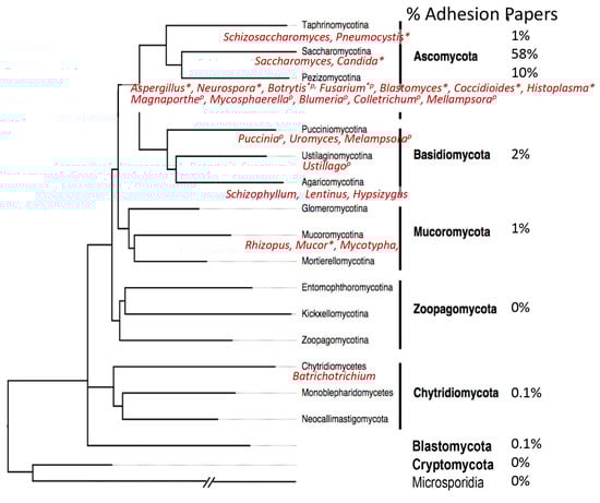 Fungal phylogenetic tree (adapted from []) showing the phyla (bold font) and subphyla. In red are the names of some genera whose cell adhesion has been studied. The genera marked * include common human pathogens, and genera marked p include top 10 plant pathogens. On the right is the fraction of papers attributable to each clade that include “adhesion” in the title.
