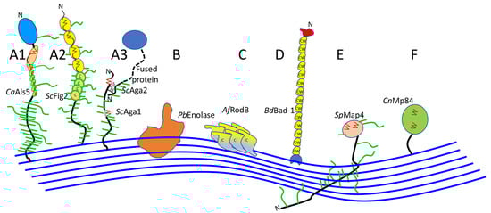 Many families of well-researched adhesins are attached through GPI anchors modified by transglycosylation to cell wall glycans (Figure 2A). The model adhesins in Figure 2B and E have parts that appear to be enmeshed in the wall matrix, which would follow a model for invertase []. It is also possible, but not demonstrated, that adhesins are bound to glucan through ester bonds between carboxylated amino acids and glucan hydroxyl groups [,] however also see []. Another known attachment is through a chitin-binding domain (drawn as a blue C-terminal domain in Figure 2D; []).
