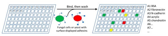 A fungal cell adhesion array would consist of a plate with different adhesion substrates printed or attached to the surface. Cells expressing adhesins would be incubated with the plate, and adherent cells scored for adherence after washing. The specific example shown shows two populations of cells labeled with red and green fluorescence, and the non-overlapping (red or green) or overlapping (yellow) adherence specificities.