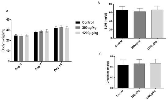 Average absolute body weight (g) per week across the duration of the study (A), and Serum total urea and creatinine concentration (B,C) in Swiss mice treated with either 300 or 1200 µg/kg of HgCl2, subcutaneously for 14 days, three times a week. Data expressed as means plus standard errors. No differences were observed between groups (p > 0.05).