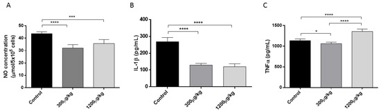 NO (A); IL-1β (B) and TNFα (C) production in cultured peritoneal macrophages from Swiss mice treated with either PBS (Control), 300 or 1200 µg/kg of HgCl2, subcutaneously for 14 days, three times a week. Peritoneal exudate cells (PECs) were stimulated overnight with LPS. The data are shown as the mean ± SD from three independent experiments (* p < 0.05; *** p < 0.001; **** p < 0.0001).