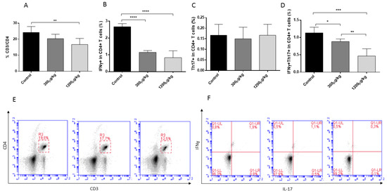 In this study, a detriment effect of Hg treatment against CD3+CD4+, Th1, and Th1/Th17 lymphocytes was detected in the treated groups. The analysis of IFNγ+, IL-17A+, and IFNγ+IL-17A+ cells from CD3+CD4+ lymphocytes revealed a significant reduction of IFNγ+ lymphocytes in both treated group of mice and a dose-dependent reduction of CD3+CD4+ lymphocytes and IFNγ+IL-17A+ population (p < 0.05) (Figure 3).