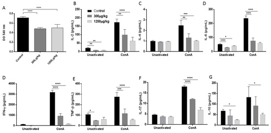Proliferative response (A) and ex vivo release of Th1/Th2/Th17 cytokines production (B–G), of splenocytes unstimulated or after ConA. Splenocytes were purified from the spleen of male Swiss mice treated with either PBS (Control), 300 or 1200 µg/kg of HgCl2, subcutaneously for 14 days, three times a week (* p < 0.05; ** p < 0.01; *** p < 0.001; **** p < 0.0001).