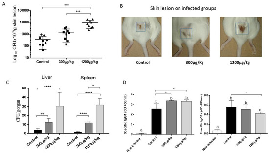 Fungal load in the inoculation site (A). Representative images of external aspect of skin lesion from each experimental group (B), fungal load in spleen and liver (C), IgG1 and IgG2a level in sera (D) of male Swiss mice treated with either PBS (Control), 300 or 1200 µg/kg of HgCl2, subcutaneously for 14 days, three times a week. The analysis was made on 14 days post fungal inoculation (* p < 0.05; ** p < 0.01; *** p < 0.001; **** p < 0.0001). Different letters above the bars represent significant differences (p < 0.05) between non-infected and infected groups.