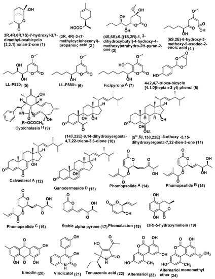 - Hussain, H.; Kliche-Spory, C.; Al-Harrasi, A.; Al-Rawahi, A.; Abbas, G.; Green, I.R.; Schulz, B.; Krohn, K.; Shah, A. Antimicrobial constituents from three endophyticfungi. Asian Pac. J. Trop. Med. 2014, 7, S224–S227. [Google Scholar] [CrossRef]