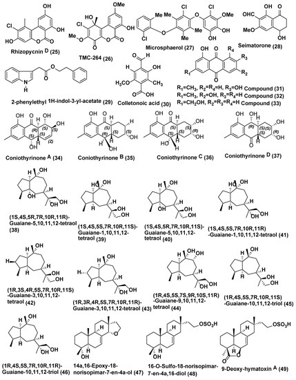 Structures of metabolites isolated from Coelomycetes (25–37) and Ascomycetes (38–49).