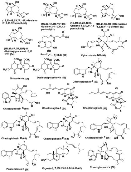 Griseofulvin (57) is very potent against the phytopathogenic fungi, but not against oomycetes [38]. Griseofulvin has been validated to possess antifungal activity against Alternaria mali, B. cinerea, C. gloeosporioides, Corticium sasaki, Fusarium oxysporum and Magnaporthe grisea in vitro with IC50 values of 18.0, 5.0, 1.7, 11.0, 30.0, and 1.7 µg/mL, respectively. Dechlorogriseofulvin (58) demonstrated poor activity, with an IC50 value of 200 µg/mL for each fungus. Griseofulvin (57) also hinders the growth of M. grisea, C. sasaki, B. cinerea, Puccinia recondite and Blumeria graminis f. sp. hordei in vivo, with a percentage of fungal control of 95, 100, 60, 90 and 90, respectively, at 150 µg/mL. Griseofulvin (57) is used to cure dermatophytic infections caused by fungi such as Epidermophyton and Trichophyton species [38].