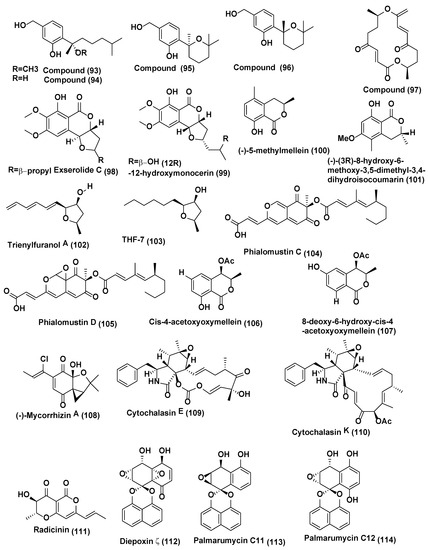Mellein (89) (Figure 4), was isolated from Pezicula sp. associated with the twigs of Forsythia viridissima, Zhejiang Province, Southeast China. Antifungal activity of this compound was tested against B. cinerea, Pythium ultimum, Fusarium oxysporium f. sp. cucumerinum, Colletotrichum orbiculare, Verticillium dahliae, Pyricularia oryzae, Pestalotia diospyri, Sclerotinia sclerotiorum and Fulvia fulva. Compound 89 displayed antifungal activity against 9 plant pathogenic fungi, esp. B. cinerea and F. fulva with EC50 values below 50 µg/mL [53].