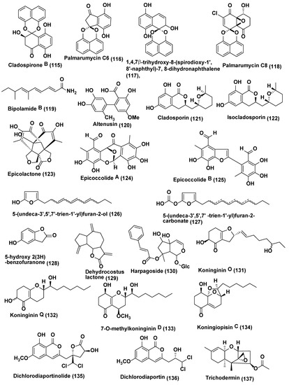 Cladosporin (121) and isocladosporin (122) (Figure 6) were isolated from endophytic fungus Cladosporium cladosporioides. Compound 121 exhibited growth inhibition against Colletotrichum acutatum, C. fragariae, C. gloeosporioides and Phomopsis viticola at 30 µM with 92.7%, 90.1%, 95.4%, and 79.9%, respectively. Similarly, compound 122 showed 50.4%, 60.2%, and 83.0% growth inhibition against C. fragariae, C. gloeosporioides, and P. viticola, respectively, at 30 µM [66].