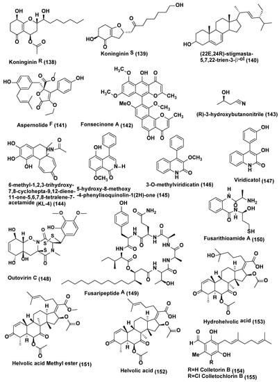 A new helvolic acid derivative named helvolic acid methyl ester (151), together with two known helvolic acid compounds, helvolic acid (152) and hydrohelvolic acid (153) (Figure 7), were extracted from endophytic fungus Fusarium sp. associated with Ficus carica leaves collected from Qinling Mountain, Shaanxi Province, China. Compounds 151–153 exhibited good antifungal activity against B. cinerea, C. gloeosporioides, F. oxysporum f. sp. niveum, Fusarium graminearum and Phytophthora capsici with MIC value in the range of 12.5–25 µg/mL while Carbendazim the standard showed MIC value in the range of 32.2–62.5 µg/mL against the same fungi [83].