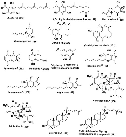 Murranolide A (158), murranopyrone (159), curvularin (160), (S)-dehydrocurvularin (161), pyrenolide A (162), modiolide A (163), and 8-hydroxy-6-methoxy-3-methylisocoumarin (164) (Figure 8) were extracted from the endophytic fungus Curvularia sp., strain M12, associated with the leaf of Murraya koenigii were collected from Rajshahi University, Bangladesh. Pyrenolide A (162) was observed to impair the mobility of Phytophthora capsici zoospores in a short time (30 min) at a low concentration (100% at 0.5 µg/mL). Murranolide A (158), murranopyrone (159), curvularin (160), (S)-dehydrocurvularin (161), modiolide A (163), and 8-hydroxy-6-methoxy-3-methylisocoumarin (164) exhibited zoospore motility impairment activity at higher concentrations (IC50: 50–100 µg/mL) [85].