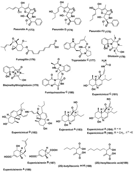 Structures of metabolites isolated from Hyphomycetes (156–169) and Basidiomycetes (170–172).