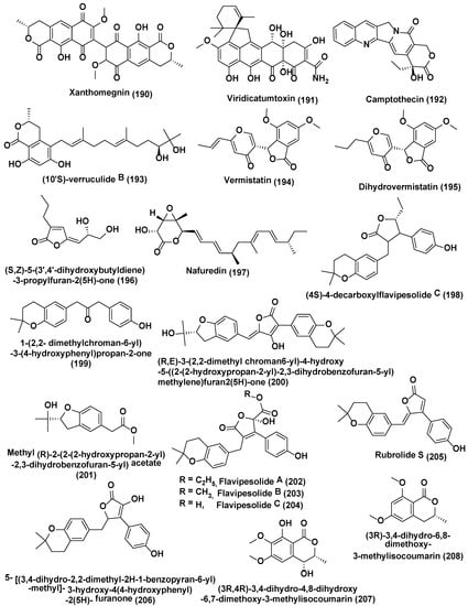 Trichothecinol A (168) (Figure 8) was obtained from Trichothecium sp. an endophytic fungus isolated from Phyllanthus amarus collected from Pune India. Compound 101 showed activity against Cryptococcus albidus (NCIM 3372) up to 20 µg/mL [87]. Trichothecin (169) (Figure 8), a sesquiterpene, was isolated from endophytic fungus Trichothecium sp. residing inside the leaves of Phyllanthus sp. collected from Pune India. Compound 169 exhibited anti-fungal activity against Saccharomyces cerevisiae, Cryptococcus albidus var diffluens NCIM 3371, Cryptococcus albidus var diffluens NCIM 3372, Fusarium oxysporum, Penicillium expansum, Trichoderma viride, Paecilomyces varioti and Aspergillus niger with MIC of 6, 20, 12, 10, 30, 40, 20 and 12 µg/mL, respectively [88].