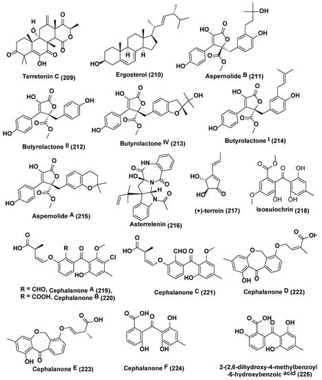 Stigmasterol derivative (22E,24R)-stigmasta-5,7,22-trien-3-β-ol (140) and a new butyrolactones, aspernolide F (141) (Figure 7) were obtained from the endophytic fungus Aspergillus terreus associated with the roots of Carthamus lanatus collected at Assiut, Egypt. Compounds 140–141 exhibited good activity against C. neoformans with IC50 values of 4.38 and 5.19 µg/mL respectively, compared to amphotericin B (IC50 0.34 µg/mL) [76].