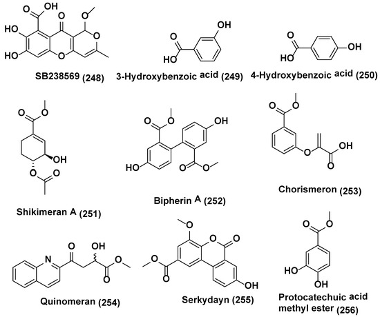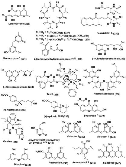 5-methylmellein (100) (Figure 5) was isolated from endophytic fungus Biscogniauxia mediterranea Ohu 19B obtained from Opuntia humifusa (Cactaceae) of United States. Antifungal activity of compound 100 was evaluated using an in vitro microdilution broth assay against seven plant pathogens i.e., Colletotrichum acutatum, C. fragariae, C. gloeosporioides, Fusarium oxysporum, B. cinerea, Phomopsis obscurans, and P. viticola. Phomopsis obscurans was found to be being most susceptible (63.5% growth inhibition) at 150 µM at 120 h. The best growth inhibition (20.1%) to F. oxysporum was at 300 µM at 48 h. Lower doses (75 and 150 µM) of this compound caused stimulation of B. cinera and C. fragariae, while all doses caused stimulation of C. acutatum and C. gloeosporioides [68].
