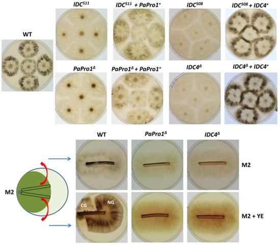 IDC phenotype of PaPro1 and IDC4 mutants. mat+/mat− heterokaryotic mycelia were inoculated onto M2 medium in Ø = 8 cm Petri plates and incubated for one week, at which time the pictures were taken. The fruiting bodies in the wild type and complemented strains are visible as small black dots. The CG tests at the bottom were made by re-inoculating (red arrows) mycelium slices grown on M2 for seven days and collected as indicated on the left scheme onto fresh media with or without yeast extract. Photos were taken five days after reinoculation. Only the wild type shows CG that originated from hyphae that were in stationary phase. NG, normal Growth.