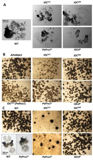 Conceptualization, V.G., R.D. and P.S.; Investigation, V.G., L.C.H.T., T.-S.N., R.D. and P.S. (V.G. deleted PaPro22 and PaPro45, complemented the mutants, tagged IDC4 with mCherry and performed phenotypic analyses, L.C.H.T. deleted PaPro1 and IDC4, T.-S.N. performed the double mutant analysis, R.D. performed the RT-qPCR analysis and P.S. identified mutations in the IDC mutants, performed the phylogenetic and bio-informatic analyses, constructed strains and performed phenotypic analyses); Resources, P.S.; Data Curation, V.G., P.S.; Writing—Original Draft Preparation, P.S.; Writing—Review & Editing, V.G., R.D., P.S.; Supervision, P.S.; Project Administration, P.S.; Funding Acquisition, P.S.