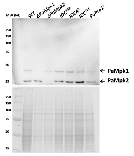 Phosphorylation of PaMpk1 and PaMpk2 is not altered in the PaPro1 and IDC4 mutants. Proteins were extracted from 48-h-old mycelia, separated on a 12% acrylamide gel and probed with an antiphospho-MAPK antibody (Top). Comassie blue-stained gel of the same extracts as loading control is at the bottom. Extracts from ΔPaMpk1 and ΔPaMpk2 mutants were loaded as controls. No difference in the amount of phosphorylation is detected for PaMpk1 and PaMpk2 phosphorylation.